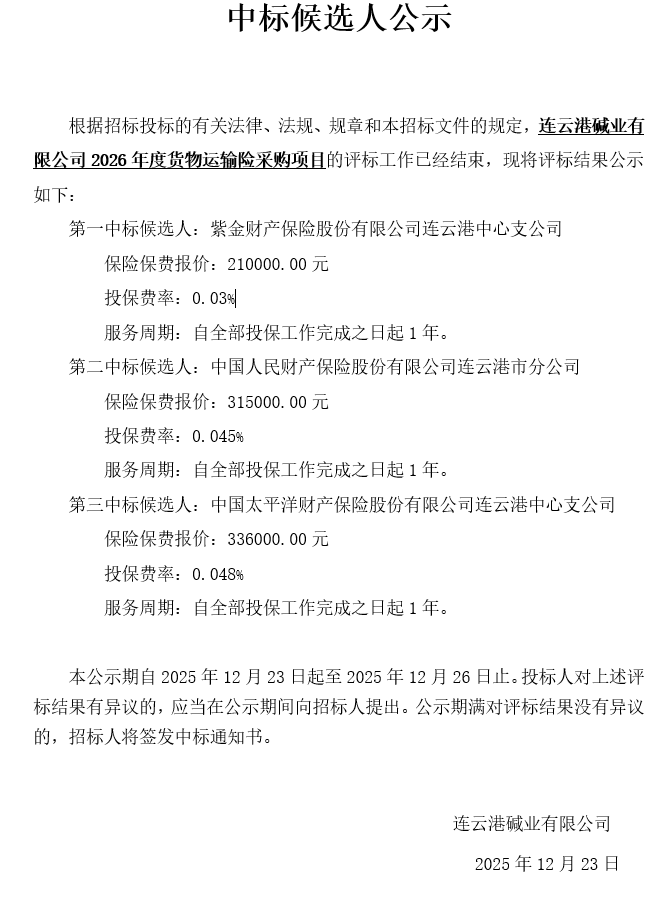 連云港堿業(yè)有限公司2026年度貨物運(yùn)輸險采購項目中標(biāo)候選人公示